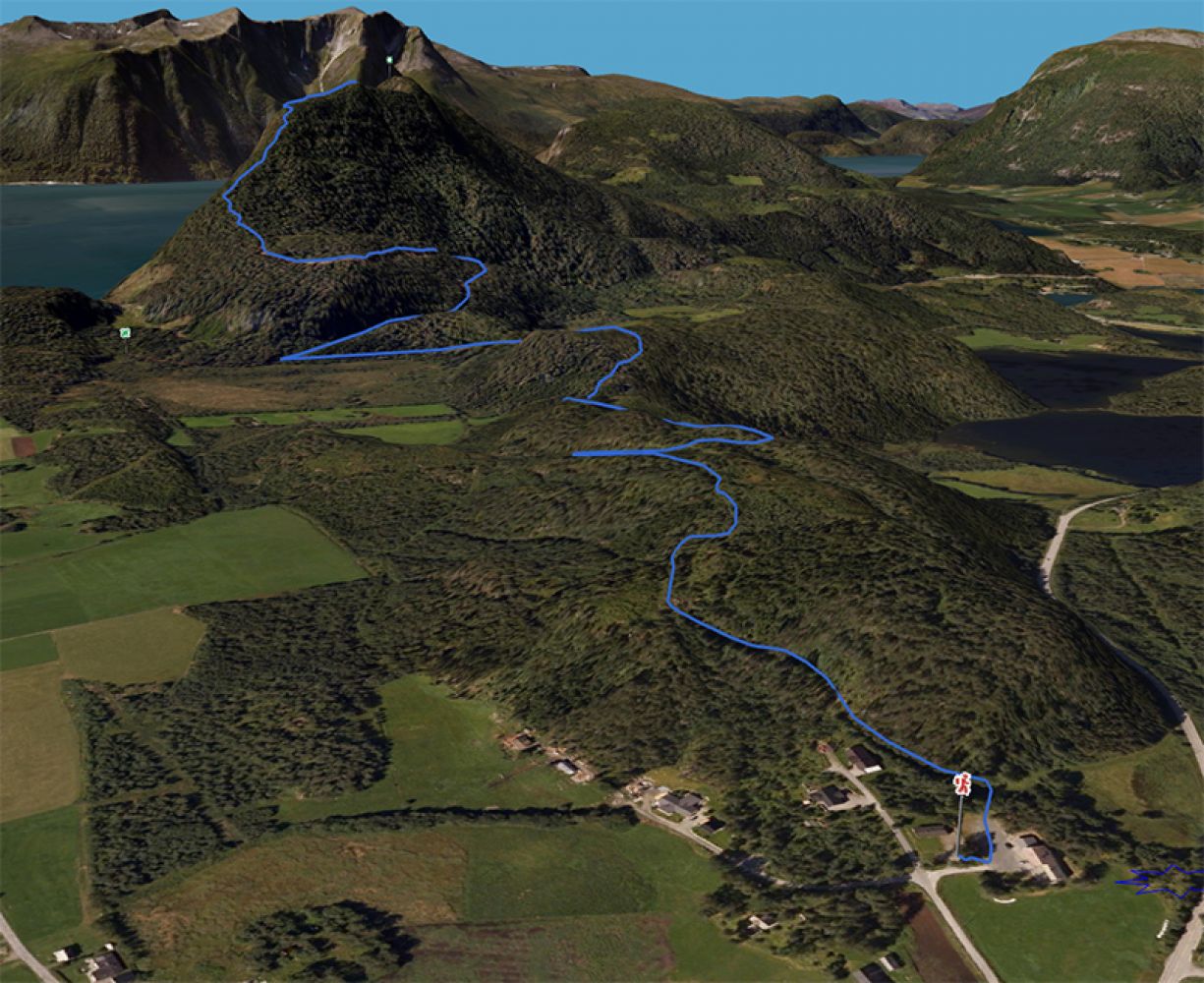 Parker ved Korsbakken grendahus. Følg rød merking langs skogsveier og stier gjennom skogen. Hold godt øye med merkinga gjennom skogen før du møter stien opp til fjellet.