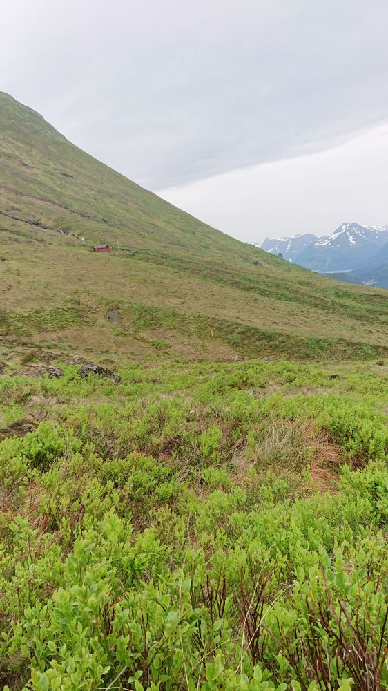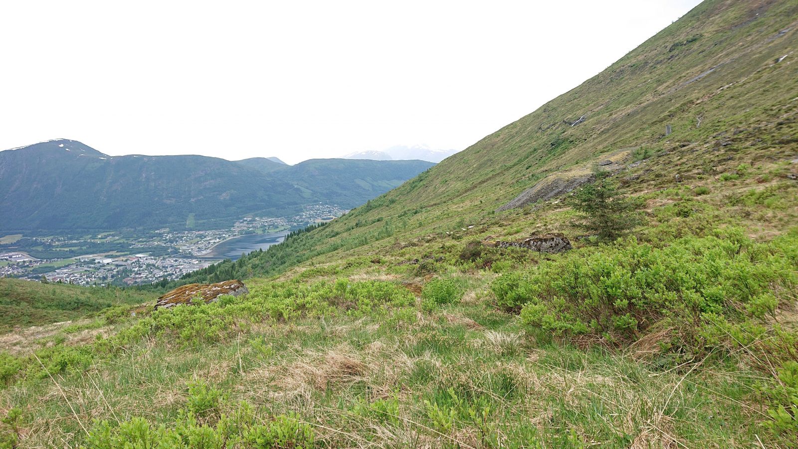Frå parkeringa ved renseanlegget går turen opp Skålavegen. Valet er å gå på grusveg eller ei rås til høgre for grusvegen.