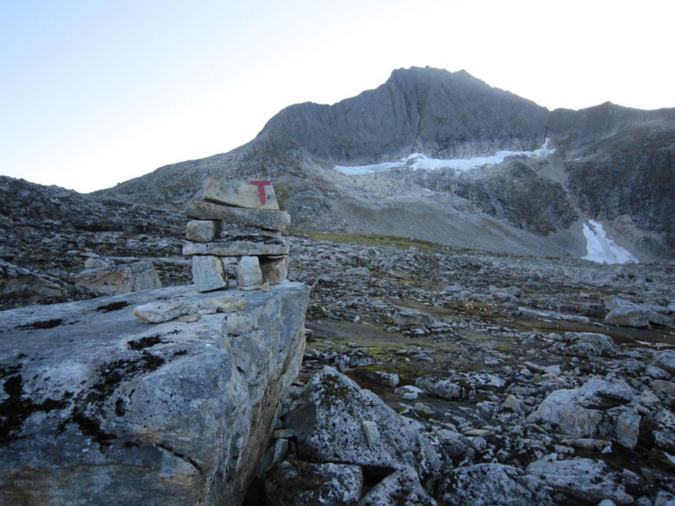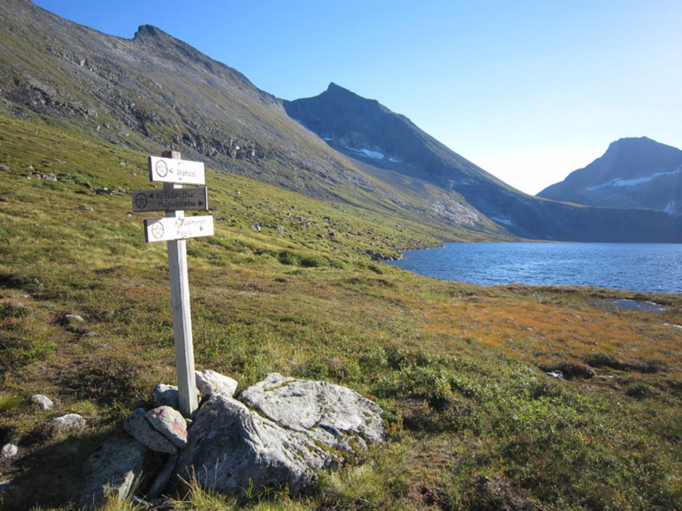 Kryss ned gjennom ura et stykke i starten til stien, et par hundre meter over vatnet, krysser over til høyre gjennom ura, og kommer ned i SØ hjørnet av vatnet. Følg deretter sti langs østkanten av vatnet til hytter i andre enden av vatnet. Herfra fortsetter stien videre nedover Kjøvdalen, ned en liten bakke like etter vatnet, deretter slakt nedover på god sti til høyre for elva ned dalen.